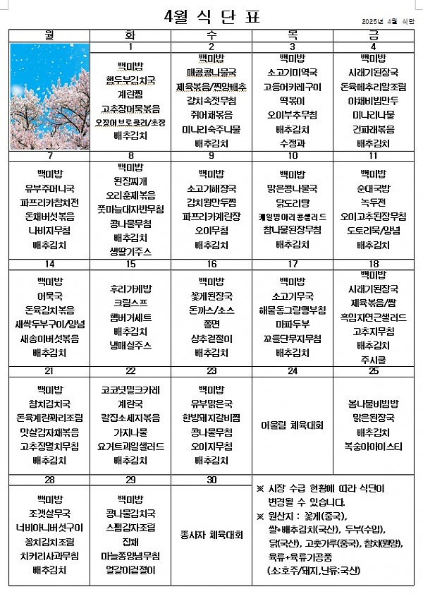 2025년 4월 식단표 ^^ 페이지 정보 작성자 관리자 작성일25-03-28 09:03 조회1,153회 댓글0건 이전글 다음글 목록 본문 4월에도 맛있게 먹고 힘 내서 열심히 일하겠습니다! ^^ 이전글 다음글 목록