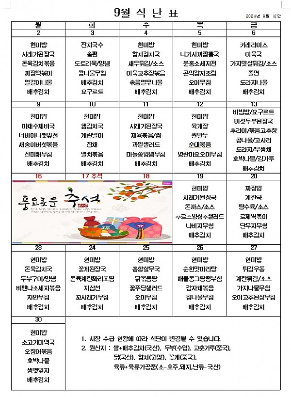 2024년 9월 식단표 ^^