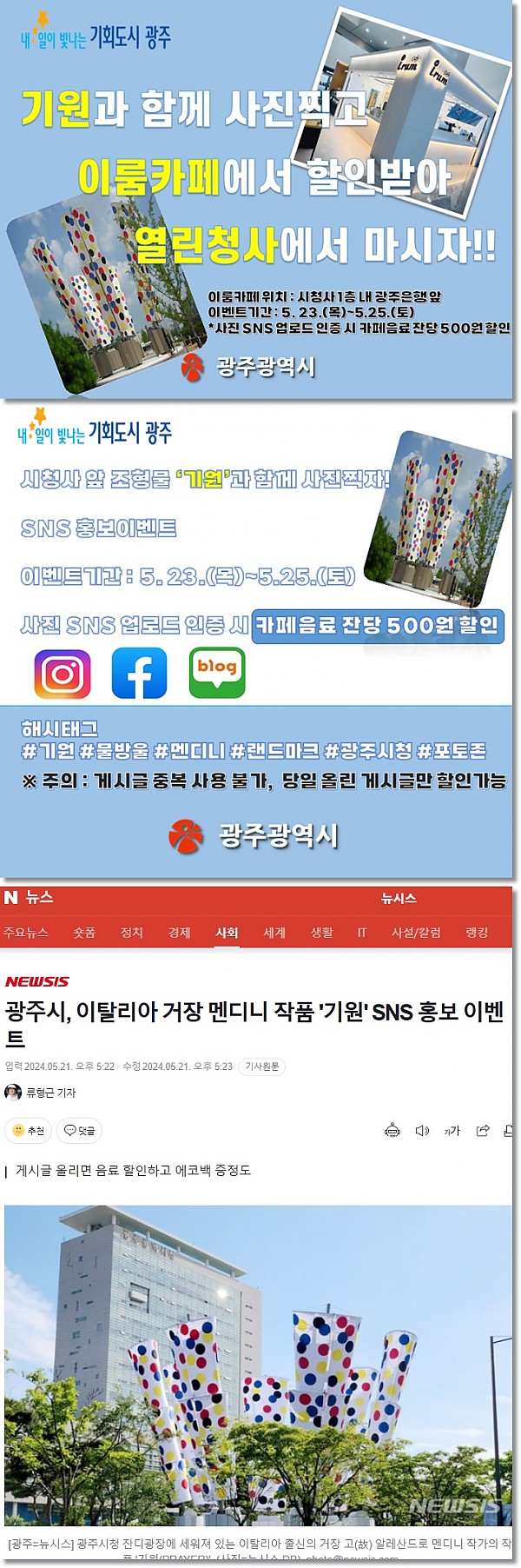 이룸카페 시청점 광주시민의날 할인 행사 페이지 정보 작성자 관리자 작성일24-06-10 15:14 조회2,978회 댓글0건 이전글 다음글 목록 본문 광주광역시 시민의날 행사 일환으로 시청사 앞 조형물 "기원"과 함께 사진찍고 SNS 인증 시 음료 할인행사를 진행했습니다. 이전글 다음글 목록