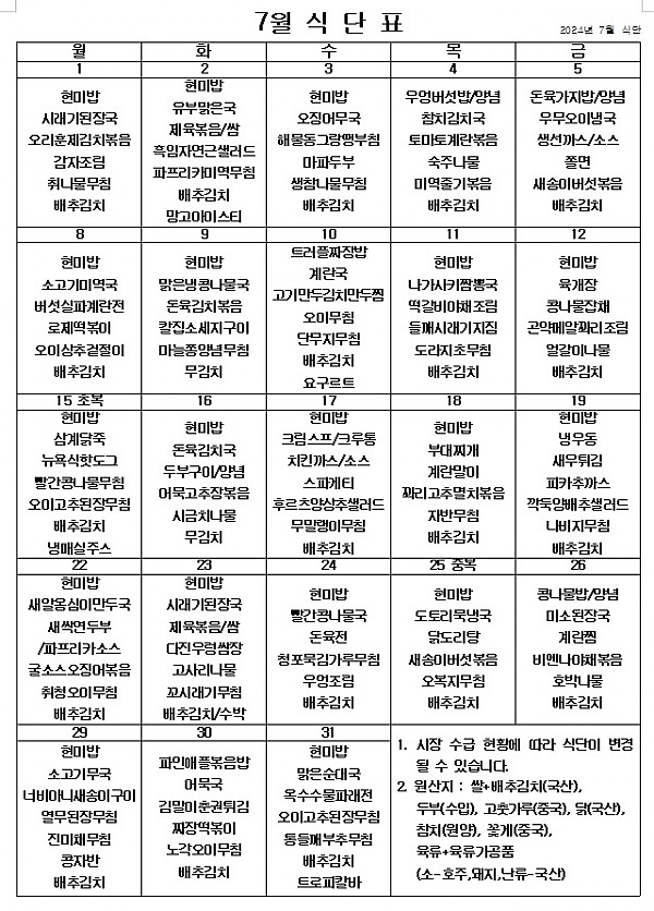 2024년 7월 식단표 ^^ 페이지 정보 작성자 관리자 작성일24-06-27 14:55 조회2,539회 댓글0건 이전글 다음글 목록 본문 무더운 여름이지만 맛있게 먹고 힘 내서 7월에도 열심히 일하겠습니다! ^^ 이전글 다음글 목록