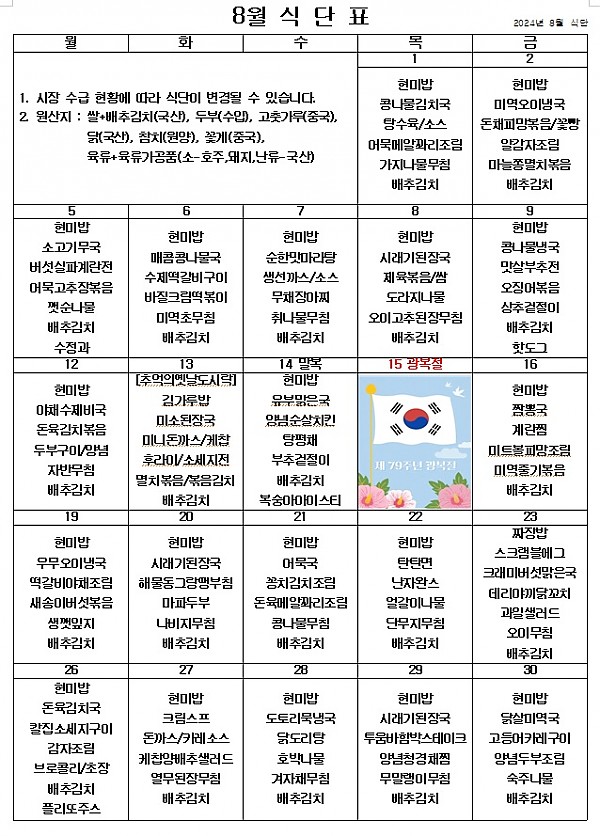 2024년 8월 식단표 ^^ 페이지 정보 작성자 관리자 작성일24-07-29 15:07 조회2,459회 댓글0건 이전글 다음글 목록 본문 더워도 너무 무더운 날씨로 많이 힘들지만 맛있게 먹고 힘 내서 8월도 열심히 달리겠습니다! ^^ 이전글 다음글 목록