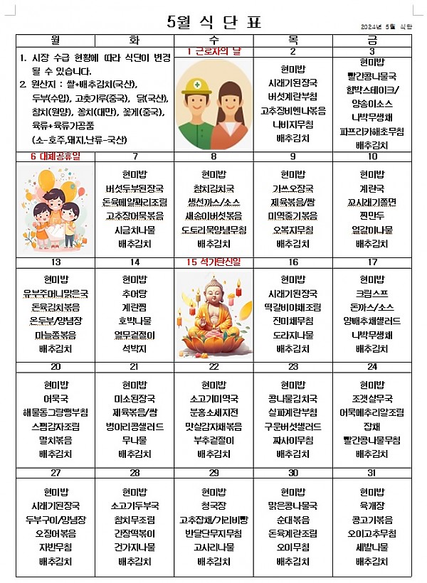 2024년 5월 식단표 ^^ 페이지 정보 작성자 관리자 작성일24-04-30 09:03 조회3,104회 댓글0건 이전글 다음글 목록 본문 5월에도 건강한 음식을 맛있게 먹고 힘내서 열심히 일하겠습니다! ^^ 이전글 다음글 목록