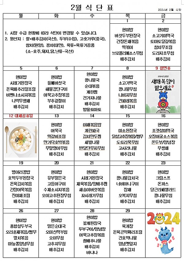 2024년 2월 식단표 ^^ 페이지 정보 작성자 관리자 작성일24-01-29 18:56 조회3,399회 댓글0건 이전글 다음글 목록 본문 맛있게 먹고 열심히 일하며 추운 겨울을 잘 이겨내겠습니다. ^^ 이전글 다음글 목록