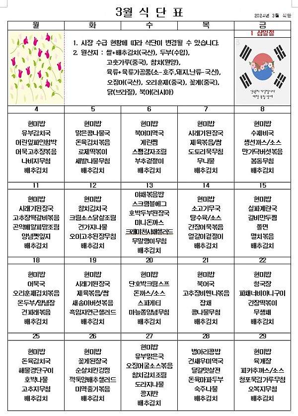 2024년 3월 식단표 ^^