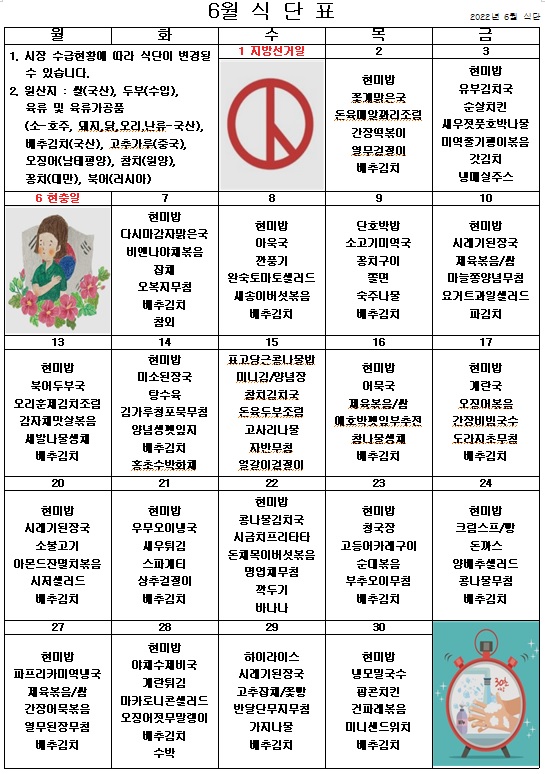 2022년 6월 식단표 ^^ 페이지 정보 작성자 관리자 작성일22-05-31 15:04 조회3,847회 댓글0건 이전글 다음글 목록 본문 더욱 알차고 맛있는 식단을 제공하도록 노력하겠습니다. ^^ 이전글 다음글 목록