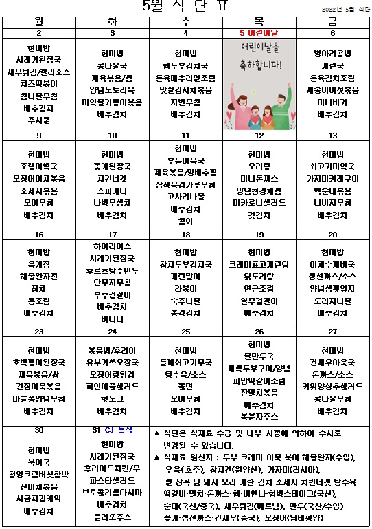 2022년 5월 식단표 ^^