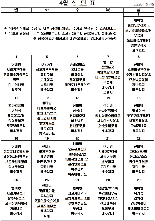 2022년 4월 식단표 ^^ 페이지 정보 작성자 관리자 작성일22-03-30 19:12 조회4,060회 댓글0건 이전글 다음글 목록 본문 코로나가 아무리 심해져도 우리의 열정을 막을순 없죠. 맛있고 건강한 식단으로 힘을 내서 슬기롭게 코로나를 이겨내보아요. ^^ 이전글 다음글 목록