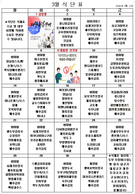 저희 식당에서는 안심하고 먹을 수 있는 건강한 식단을 제공해드리면서 지금 이 시기를 슬기롭게 잘 이겨낼 수 있도록 도움을 드리고자 합니다. 3월에도 2월에 그랬던 것처럼 제철 식재료와 국산 식재료를 애용하려고 합니다.