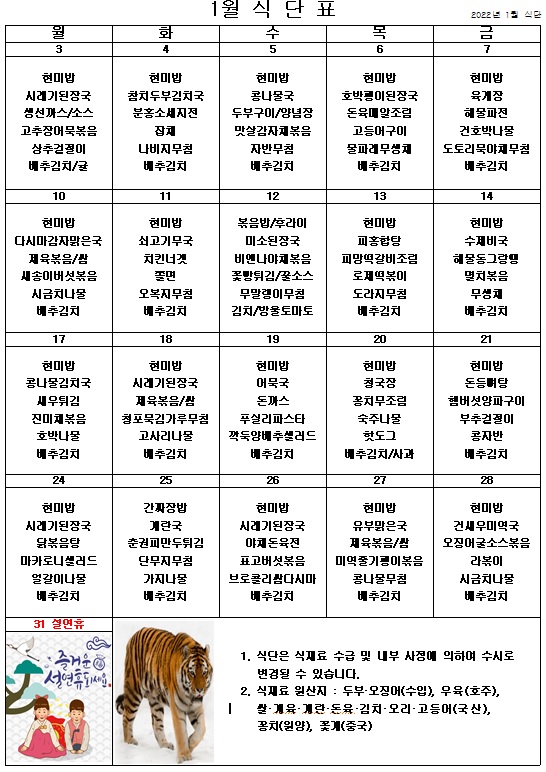 2022년 1월 식단표 ^^ 페이지 정보 작성자 관리자 작성일21-12-31 09:51 조회4,015회 댓글0건 이전글 다음글 목록 본문 계속되는 코로나로 힘들고 지치지만 안전하고 맛있게 먹으면서 지금 시기를 잘 이겨내보아요! ^^ 이전글 다음글 목록