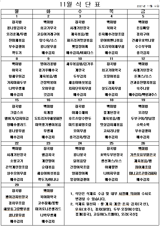 2021년 11월 식단표 ^^ 페이지 정보 작성자 관리자 작성일21-10-29 15:03 조회4,384회 댓글0건 이전글 다음글 목록 본문 날씨는 쌀쌀해지고 있지만 맛있게 먹고 힘내서 열심히 생활합시다! ^^ 이전글 다음글 목록