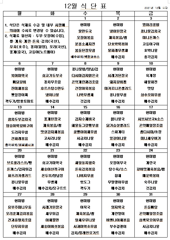 2021년 12월 식단표 ^^ 페이지 정보 작성자 관리자 작성일21-11-30 09:10 조회4,075회 댓글0건 이전글 다음글 목록 본문 어느덧 연말이 코 앞이네요. 맛있게 먹고 건강하게 지내면서 위드 코로나 시대를 현명하게 잘 이겨내봐요! ^^ 이전글 다음글 목록
