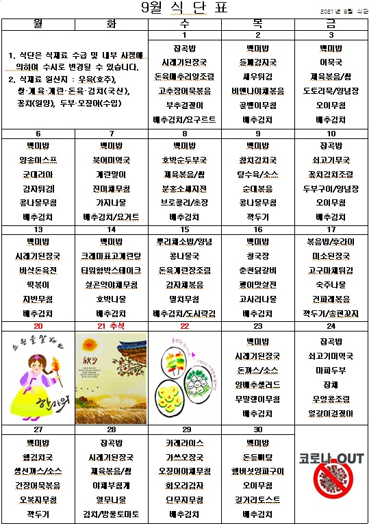 2021년 9월 식단표 ^^ 페이지 정보 작성자 관리자 작성일21-09-01 17:25 조회4,234회 댓글0건 이전글 다음글 목록 본문 맛있게 먹고 힘내서 화이팅! ^^ 이전글 다음글 목록