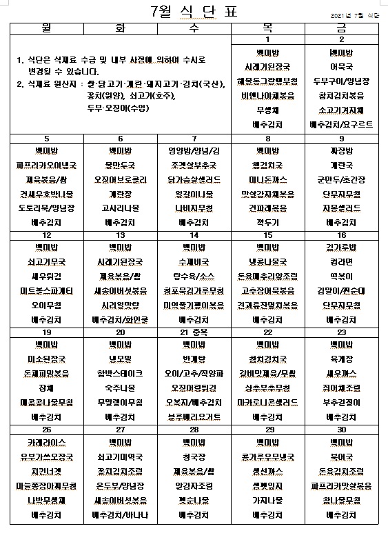 2021년 7월 식단표 페이지 정보 작성자 관리자 작성일21-06-30 15:25 조회4,208회 댓글0건 이전글 다음글 목록 본문 더워지는 여름 맛있게 먹고 모두 힘냅시다! ^^ 이전글 다음글 목록