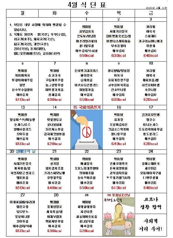 2020년 4월 식단 페이지 정보 작성자 관리자 작성일20-04-01 18:28 조회4,838회 댓글0건 이전글 다음글 목록 본문 코로나 바이러스를 잘 이겨냅시다! 사회적 거리 두기 실천 식후 식당 방역 소독 철저 이행 이전글 다음글 목록