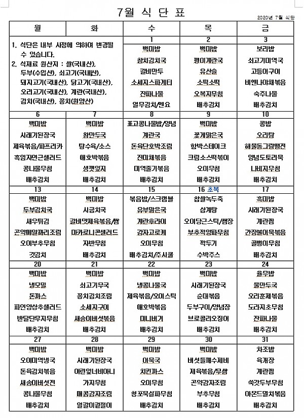 2020년 7월 식단 ^^ 페이지 정보 작성자 관리자 작성일20-06-30 17:27 조회4,511회 댓글0건 이전글 다음글 목록 본문 코로나바이러스가 우리 주변에도 서성이고 있어서 무섭습니다. 그래도 맛있게 먹고 화이팅! ^^ 이전글 다음글 목록