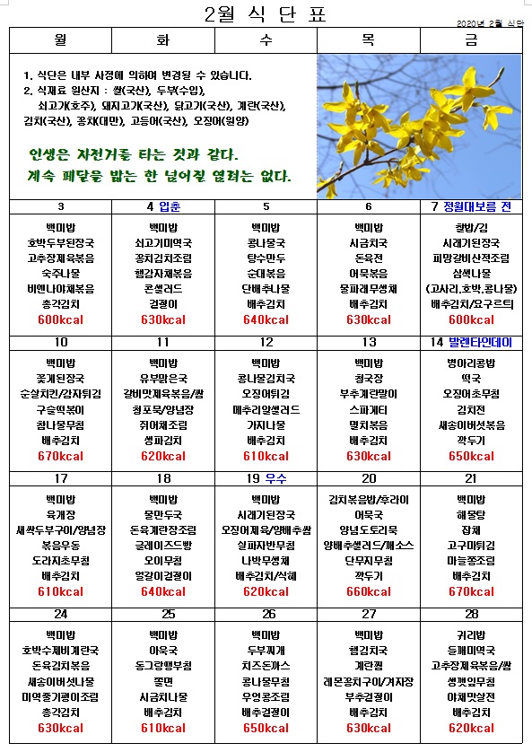 2020년 2월 식단표 페이지 정보 작성자 관리자 작성일20-02-03 19:04 조회4,729회 댓글0건 이전글 다음글 목록 본문 즐거운 점심시간 ^^ 맛있는 음식으로 활기찬 하루를 보내요! 이전글 다음글 목록
