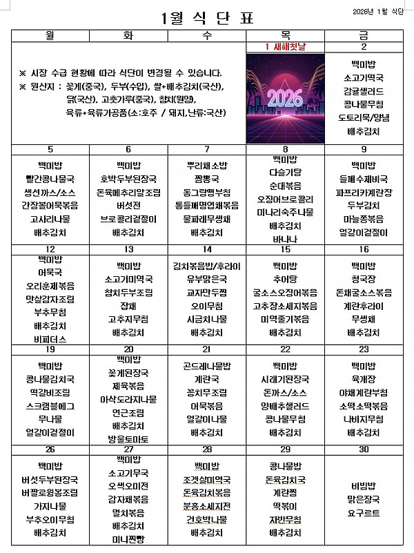 2026년 1월 식단표 ^^ 페이지 정보 작성자 관리자 작성일25-12-30 18:46 조회256회 댓글0건 이전글 다음글 목록 본문 새해를 맞이하여 밝고 건강한 마음으로 1월도 맛있게 먹고 열심히 일하겠습니다. ^^ 이전글 다음글 목록