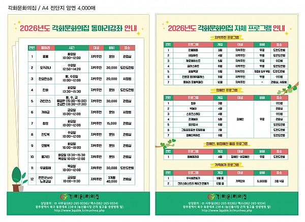26년도 동아리활동 및 프로그램 안내 페이지 정보 작성자 정관용 작성일26-01-16 17:02 조회109회 댓글0건 이전글 다음글 목록 본문 26년도 동아리 전체 활동 안내 및 프로그램 안내합니다. 이전글 다음글 목록