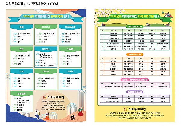2024 동아리강좌 및 프로그램 안내 페이지 정보 작성자 정관용 작성일24-01-09 13:02 조회3,352회 댓글0건 다음글 목록 본문 각화문화의집 24년도 동아리강좌 및 프로그램 안내 올립니다.. 참고하시고 모든 분들 새해 복 많이 받으시길 바라겠습니다~~ 다음글 목록