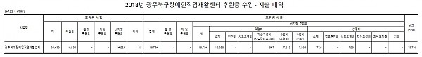 2018 광주북구장애인직업재활센터 후원금 수입 및 사용내역 페이지 정보 작성자 관리자 작성일19-03-27 10:10 조회12,832회 댓글0건 이전글 다음글 목록 본문 사회복지법인 및 사회복지시설 재무․회계규칙 제 19조 및 제 20조, 제 41조의 6의 규정에 의거하여 2018 광주북구장애인직업재활센터 후원금 수입 및 사용 내역을 다음과 같이 공개합니다. 이전글 다음글 목록