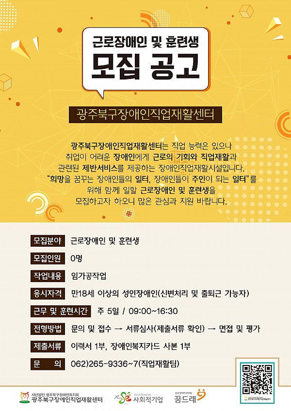2019년 광주북구장애인직업재활센터 근로장애인 및 훈련생 모집 공고 페이지 정보 작성자 관리자 작성일19-09-19 13:11 조회13,084회 댓글0건 이전글 다음글 목록 본문 광주북구장애인직업재활센터에서는 위와 같이 근로장애인 및 훈련생을 모집하오니 많은 관심과 지원 바랍니다. 이전글 다음글 목록