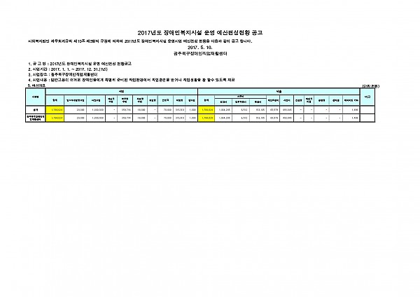 2017년 광주북구장애인직업재활센터 세입세출(예산) 공고 페이지 정보 작성자 배지연 작성일17-05-10 19:00 조회14,448회 댓글0건 이전글 다음글 목록 본문 사회복지법인 재무회계규칙 제10조 제3항의 규정에 의하여 2017년도 장애인복지시설 운영사업 예산편성현황을 다음과 같이 공고합니다. 이전글 다음글 목록