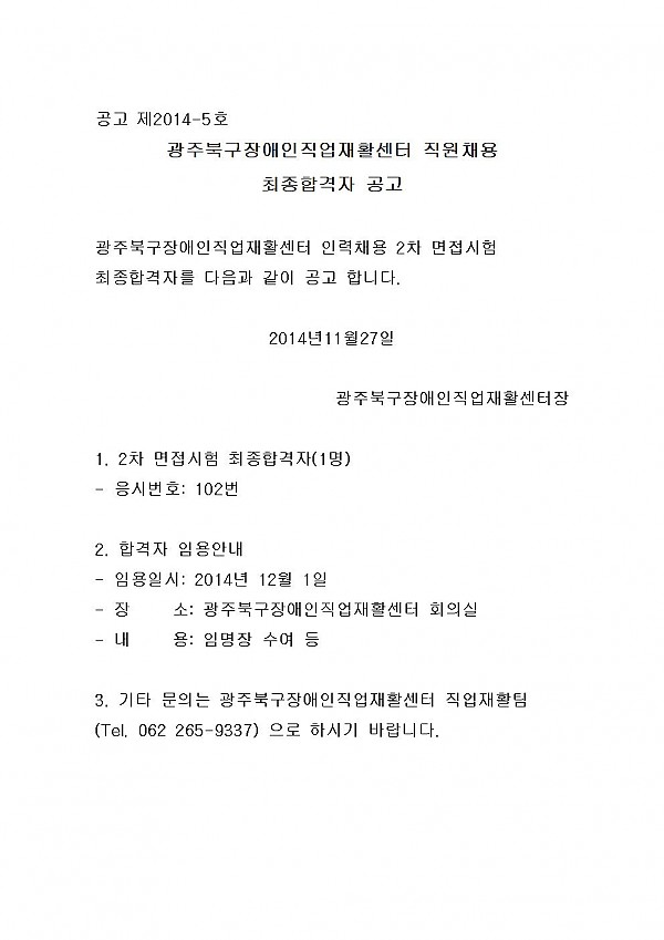 광주북구장애인직업재활센터 직원채용 최종합격자 공고 페이지 정보 작성자 배지연 작성일14-11-27 08:57 조회14,201회 댓글0건 이전글 다음글 목록 본문 광주북구장애인직업재활센터 직원 채용에 관심 가져 주신 모든분들께 감사드립니다. 이전글 다음글 목록