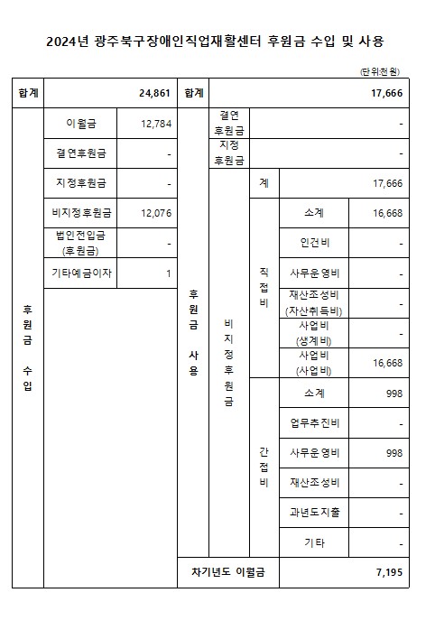 2024년 광주북구장애인직업재활센터 후원금 수입 및 사용내역 공고 페이지 정보 작성자 관리자 작성일25-03-11 16:06 조회7,798회 댓글0건 이전글 다음글 목록 본문 사회복지법인 및 사회복지시설 재무․회계규칙 제41조의 6의 규정에 의거하여 2024년 광주북구장애인직업재활센터 후원금 수입 및 사용 내역을 다음과 같이 공개합니다. 이전글 다음글 목록