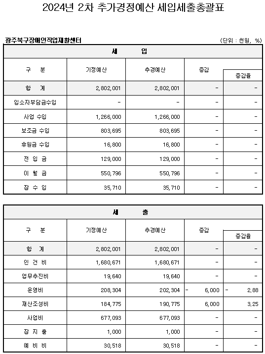 2. 공고사항 : 2024년 광주북구장애인직업재활센터 2차 추가경정 세입·세출 예산서