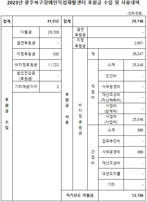 2023년 광주북구장애인직업재활센터 후원금 수입 및 사용내역 페이지 정보 작성자 관리자 작성일24-03-05 16:45 조회22,838회 댓글0건 이전글 다음글 목록 본문 사회복지법인 및 사회복지시설 재무․회계규칙 제41조의 6의 규정에 의거하여 2023년 광주북구장애인직업재활센터 후원금 수입 및 사용 내역을 다음과 같이 공개합니다. 이전글 다음글 목록