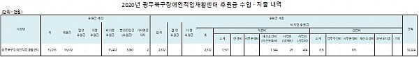 2020 광주북구장애인직업재활센터 후원금 수입 및 사용내역 페이지 정보 작성자 관리자 작성일21-03-24 14:07 조회12,518회 댓글0건 이전글 다음글 목록 본문 사회복지법인 및 사회복지시설 재무․회계규칙 제41조의 6의 규정에 의거하여 2020 광주북구장애인직업재활센터 후원금 수입 및 사용 내역을 다음과 같이 공개합니다. 이전글 다음글 목록