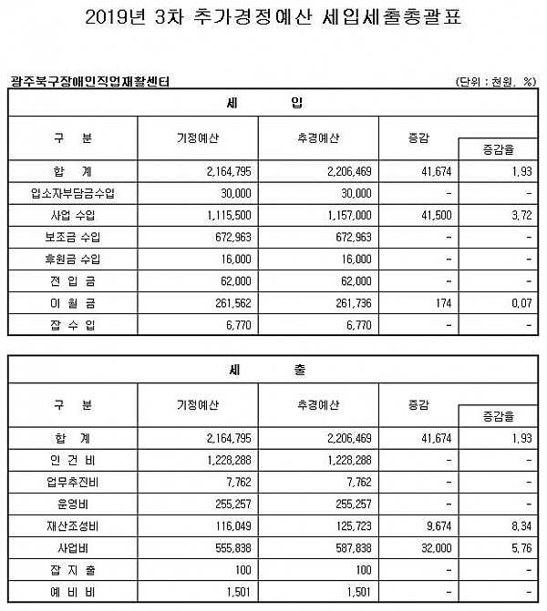 2019 광주북구장애인직업재활센터 3차 추가경정 세입·세출 예산안 공고