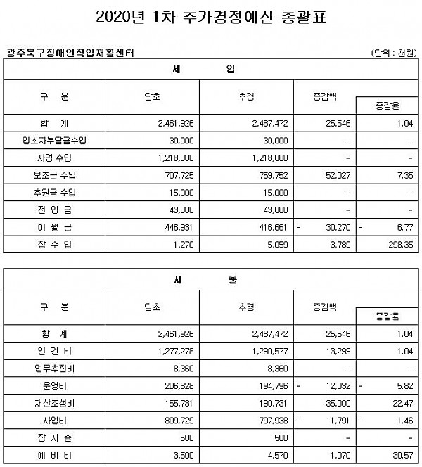 2020 광주북구장애인직업재활센터 1차 추가경정 세입세출(예산) 공고