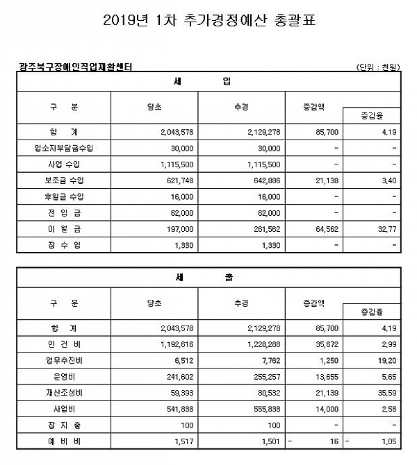 2019 광주북구장애인직업재활센터 1차 추가경정 세입세출(예산) 공고
