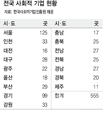 이렇게 장애인 등 취약 계층을 고용해 영업활동을 하는 사회적 기업들이 전국 곳곳에서 쑥쑥 성장하고 있다. 올해 전국에서 운영중인 사회적 기업은 555곳으로, 2007년 사회적기업지원법에 따라 55곳이 생겨난 지 4년 만에 10배로 늘었다. 캐나다·영국·미국 등 국외에도 20곳이 생겨났고, 예비 사회적 기업도 전국에서 1005곳이 생겼다. 고용노동부는 지난해 1487억원, 올해 1453억원의 예산을 투입하는 등 사회적 기업 확대에 공을 들이고 있다. 황명구 충북도 사회복지정책보좌관은 “사회적 약자를 고용해 임금(월 98만원)과 경영을 지원하는 사회적 기업이 지역에 활기를 불어넣고 있다”고 말했다.