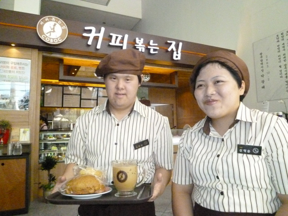 5일 오전 광주광역시 서구 치평동 광주시청 1층 커피전문점 ‘이룸카페’. 단정한 세로줄 유니폼을 입은 장애인 김희성(31)씨와 신덕순(29)씨 등 직원들이 커피향과 빵냄새가 은은한 매장 안을 이리저리 살펴가며 문 열 준비를 서둘렀다. 두 사람은 냉장 진열대의 유리를 닦고, 팥빙수 재료를 챙기는 등 바삐 손을 놀렸다. 김씨는 “월급 액수는 중요하지 않다”며 “맘 편하게 일할 자리가 있어 행복하다”고 했고, 신씨는 “장시간 서 있는 게 힘들어도 내가 만든 팥빙수를 사람들이 맛있게 먹는 걸 보면 피로가 풀린다”며 웃었다.